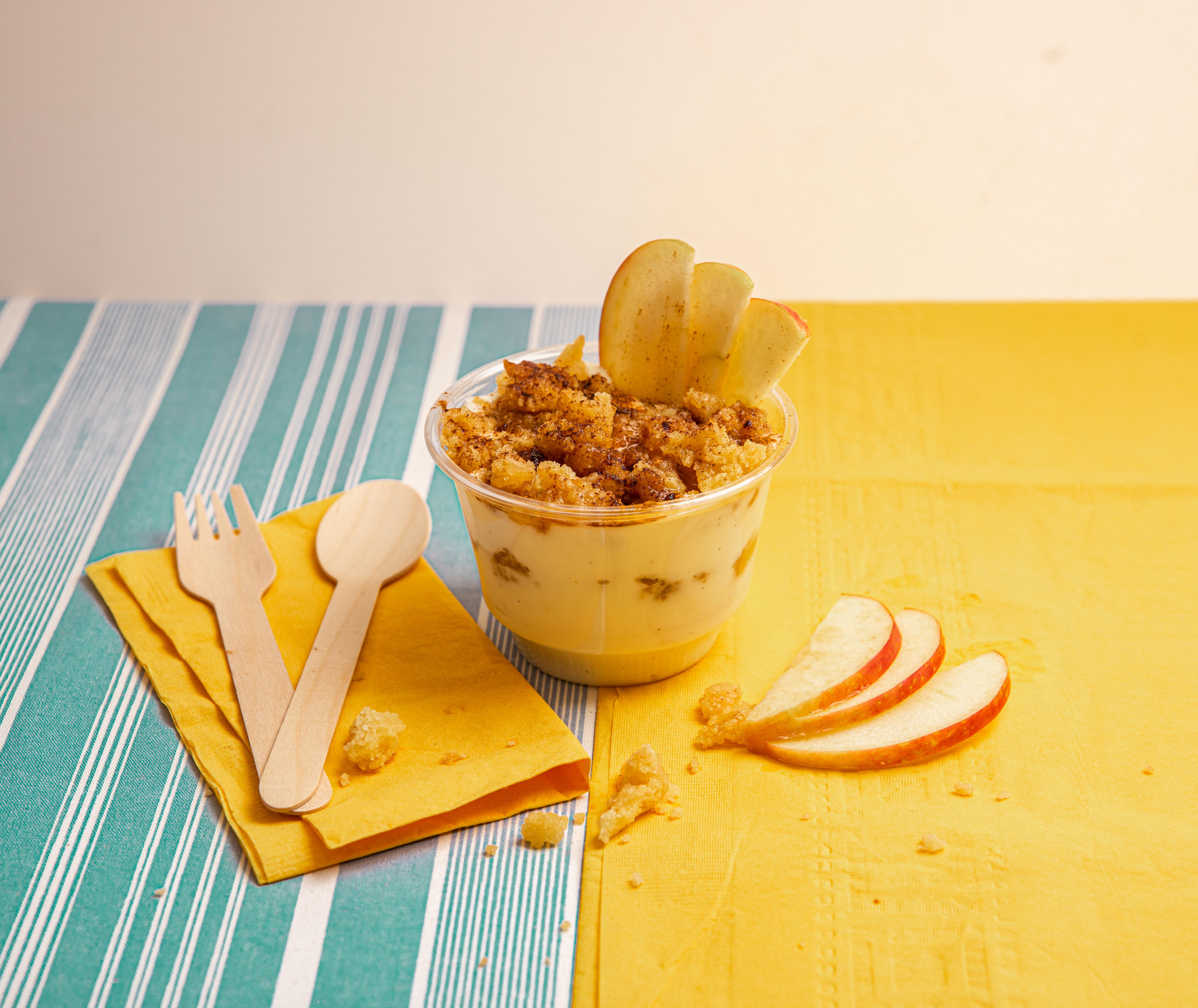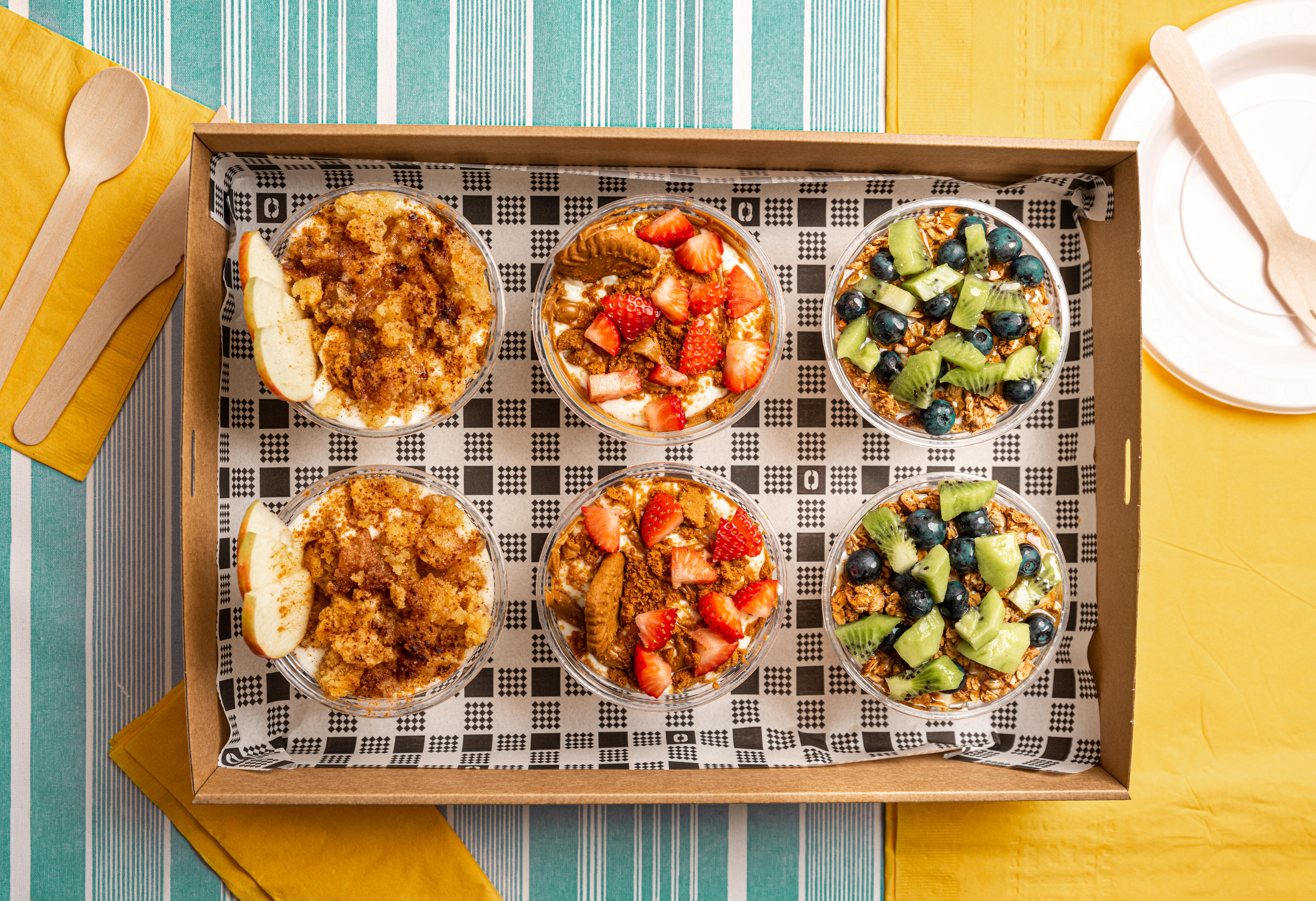 Each platter contains a selection of indulgent flavors such as biscoff, apple crumble, and mixed fruit with granola, striking the perfect balance between sweet and tangy for a wholesome and gratifying treat.